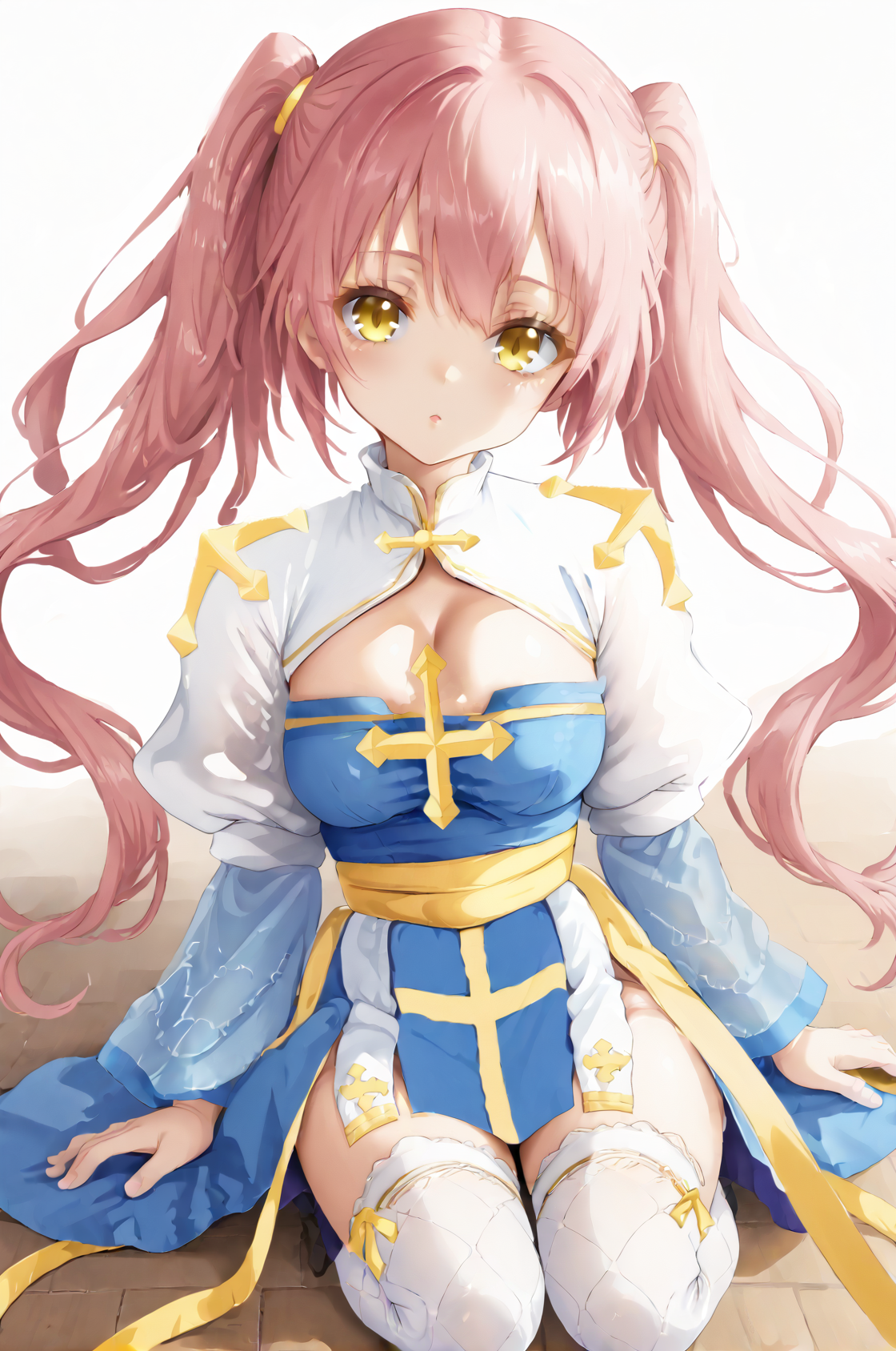 提示词:bishopRO,白色过膝袜,渔网腿饰,长袖,蓝色连衣裙,蓬松袖子,露胸剪裁,侧开叉,珠宝,十字架,短外套(衣物),黄色腰带
