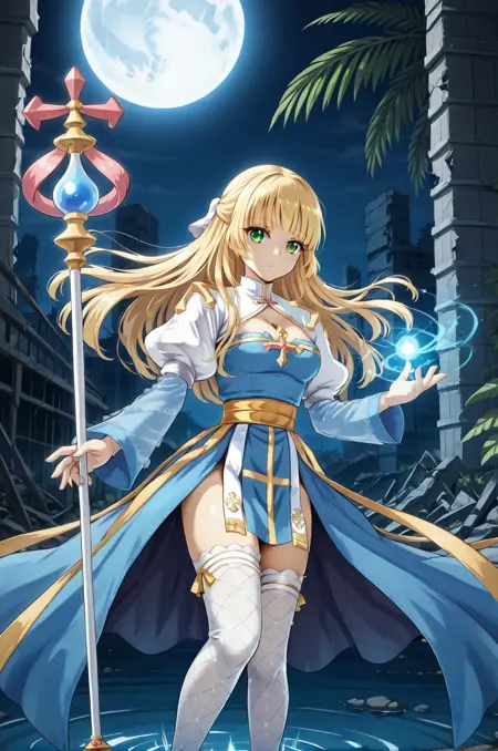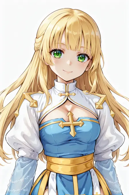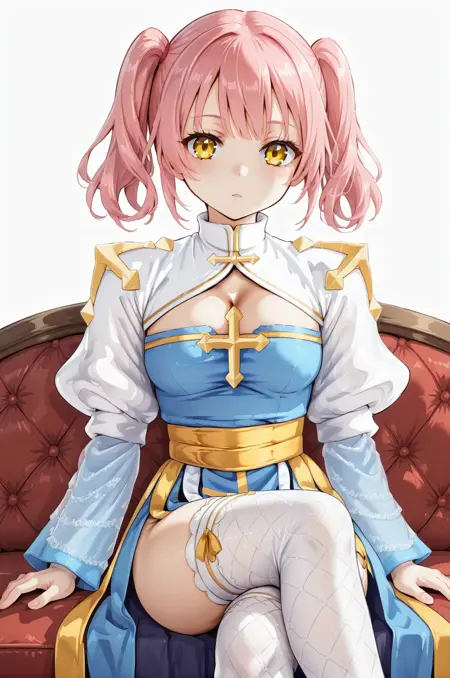 prompt: bishopRO, white thighhighs, fishnet legwear, long sleeves, blue dress, puffy sleeves, cleavage cutout, side slit, jewelry, cross, shrug (clothing), yellow sash