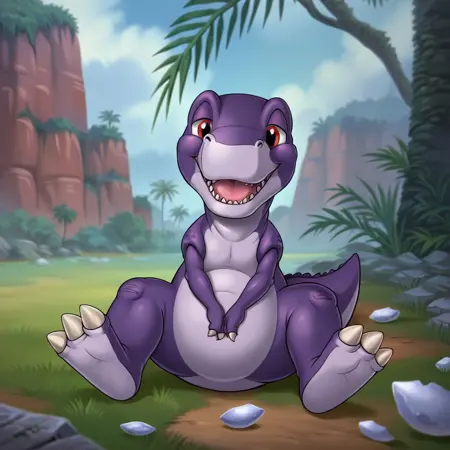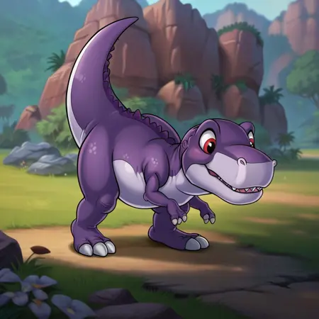 Chomperlbt, feral, male, Tyrannosaurus, theropod, bipedal, dinosaur, scalie, purple skin, red eyes, young feral