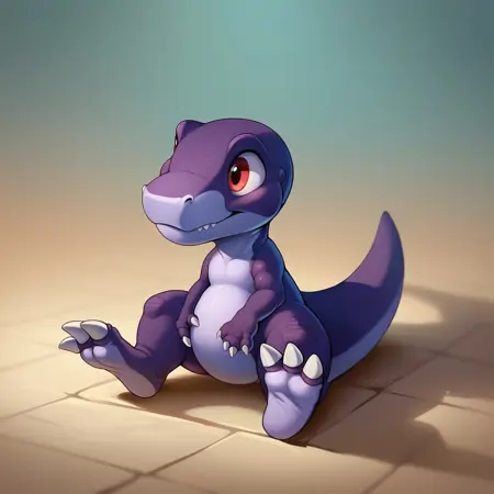 Chomperlbt, feral, male, Tyrannosaurus, theropod, bipedal, dinosaur, scalie, purple skin, red eyes, young feral