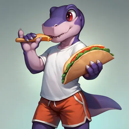 Chomperlbt, anthro, male, Tyrannosaurus, theropod, bipedal, dinosaur, scalie, purple skin, red eyes, young anthro
