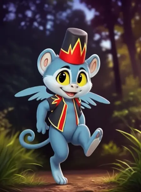 LymanFlyMon, monkey, (( wings), blue fur), yellow sclera, vest, chibi, red-black vest, red-black small hat,