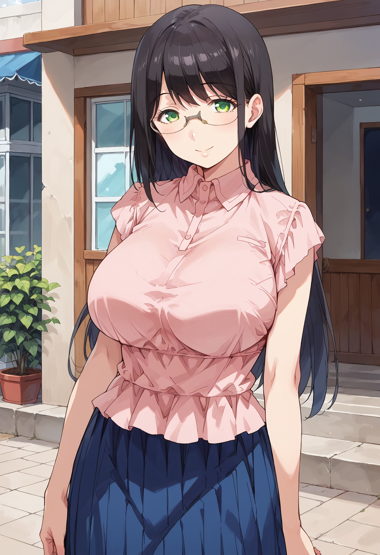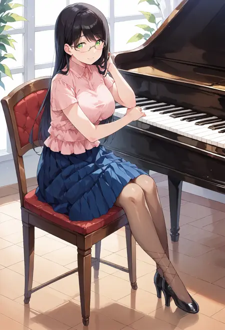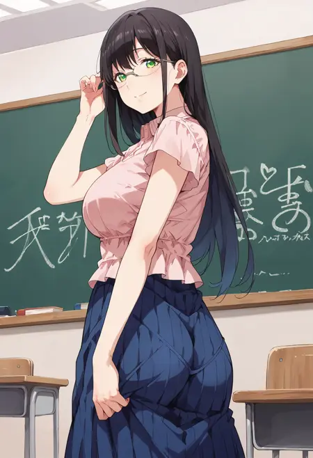 hanyuyuzuki, green eyes, black hair, rimless eyewear, long hair, swept bangs,