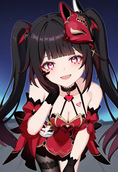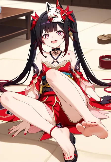 shisparkle, long hair, bangs, brown hair, hair ornament, red eyes, mole under eye, bare shoulders, twintails, hair ribbon, choker, detached sleeves, fox mask, mask on head, red dress, red kimono, bell, obi, sash, single glove, black gloves, tattoo, red nails,