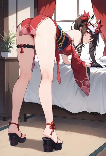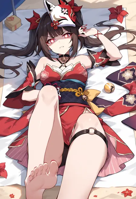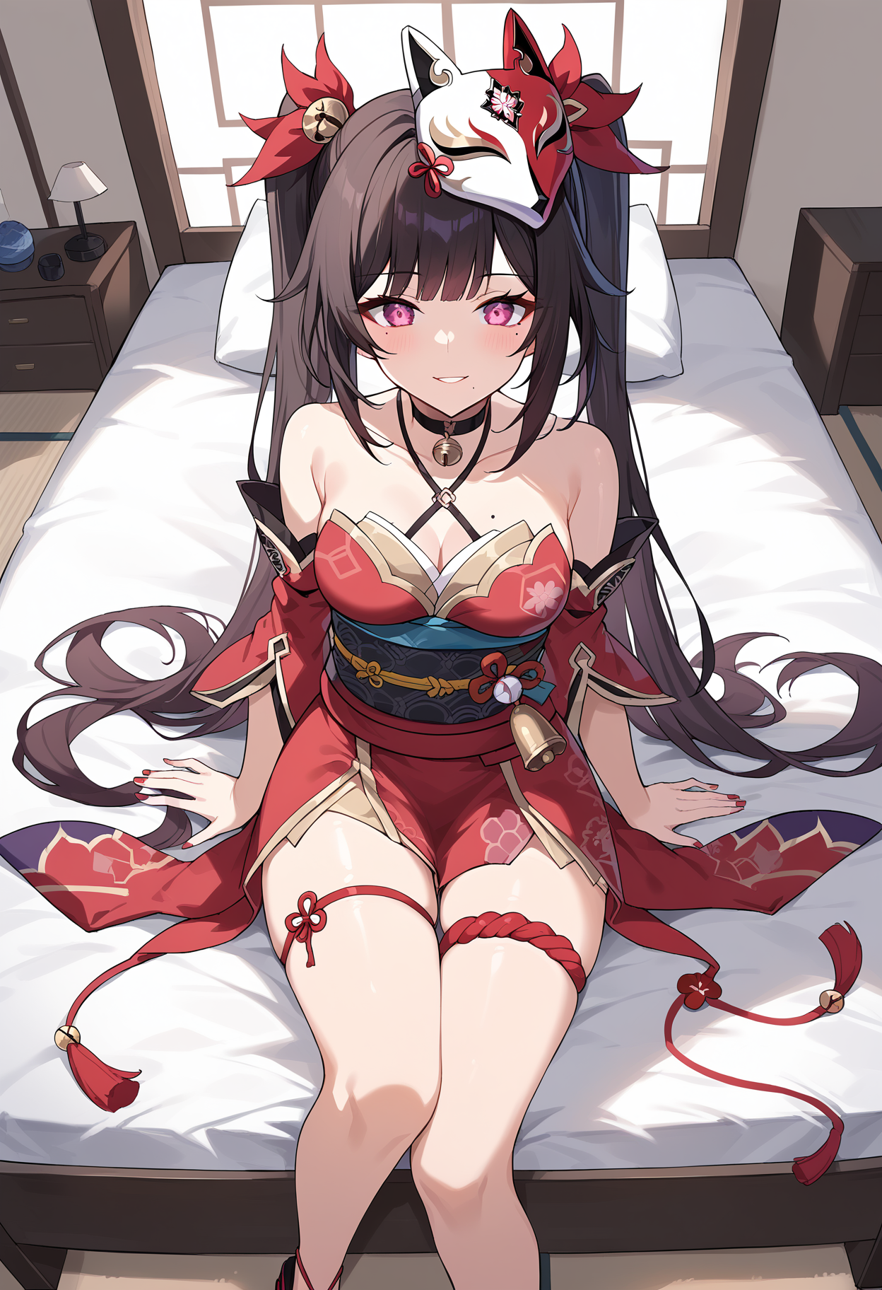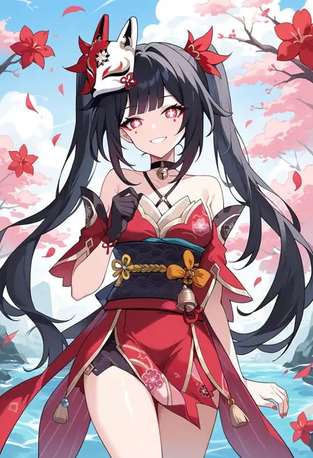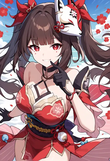 shisparkle, long hair, bangs, brown hair, hair ornament, red eyes, mole under eye, bare shoulders, twintails, hair ribbon, choker, detached sleeves, fox mask, mask on head, red dress, red kimono, bell, obi, sash, single glove, black gloves, tattoo, red nails,