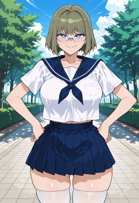 7. ((前髪、メガネ、制服、プリーツスカート、ネクタイ付き短袖セーラー襟シャツ、タイツ))