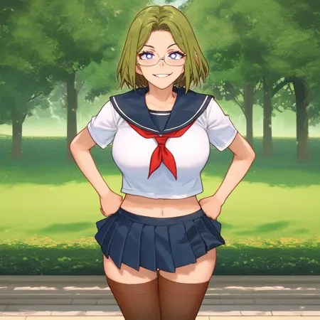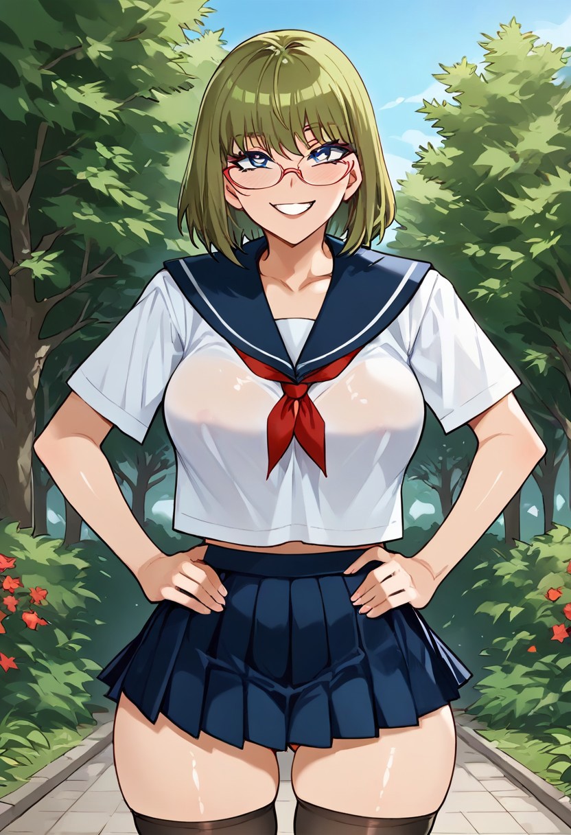 7. ((刘海,眼镜,校服,百褶裙,短袖水手领衬衫配领结,过膝袜,))