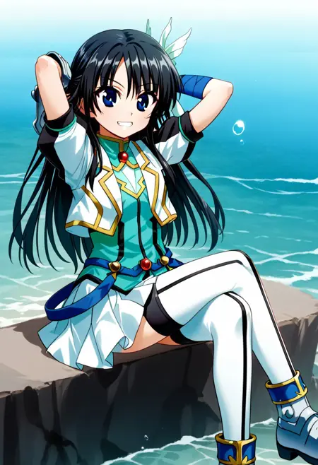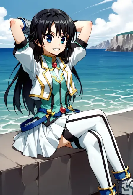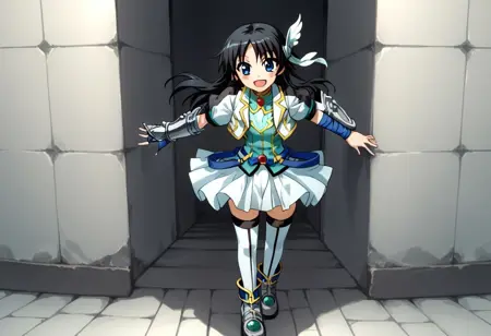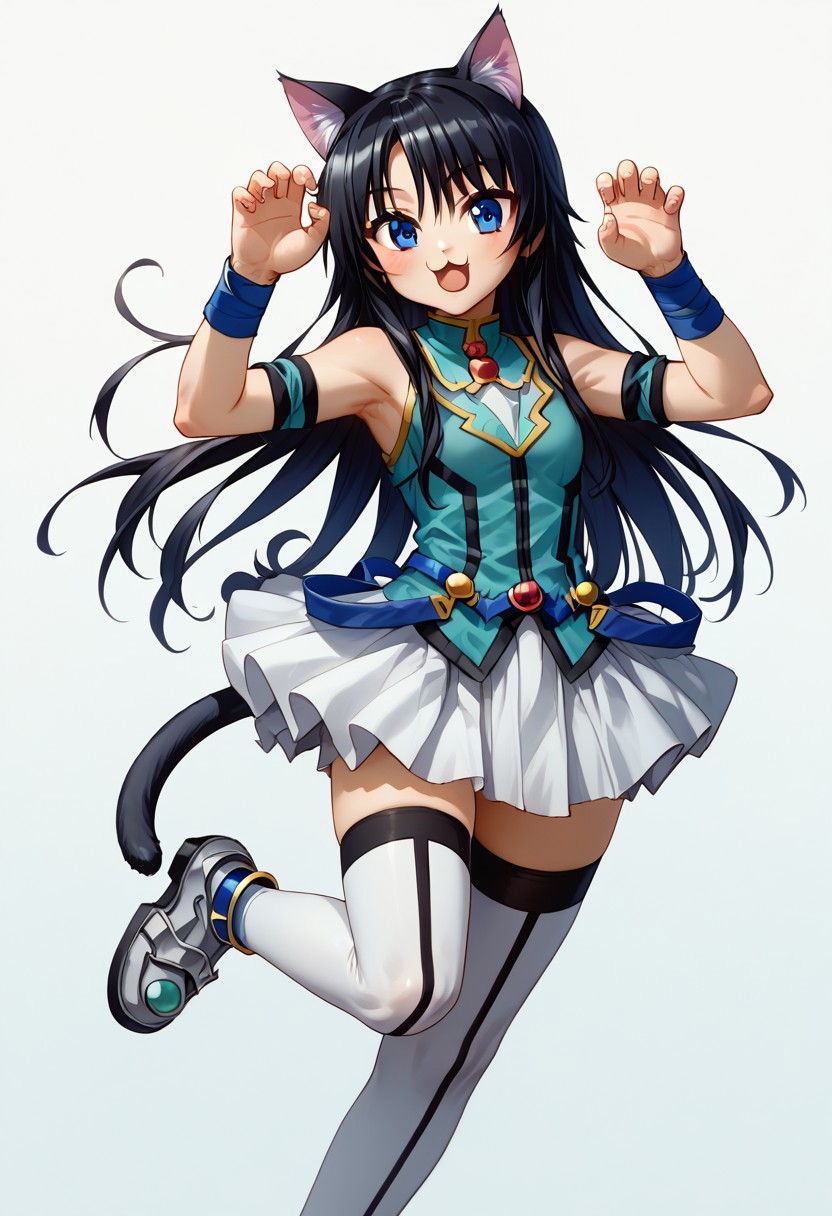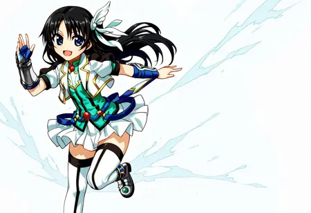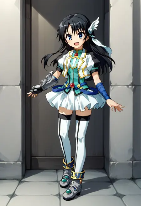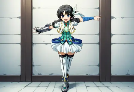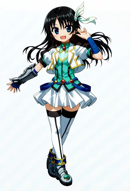 -Combat Uniform Variant: black and white cropped jacket with yellow trim, cyan shirt, blue belts, white pleated skirt, miniskirt, layered skirt, white thighhighs, blue anklet, metal shoes, red gem, armband, one metal gauntlet,