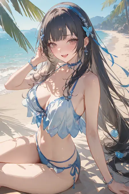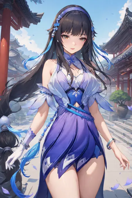 ,brown eyes, black hair, single glove, white gloves, purple dress, hairband, hair ornament, bracelet, <lora:Xishi_xl:0.8>