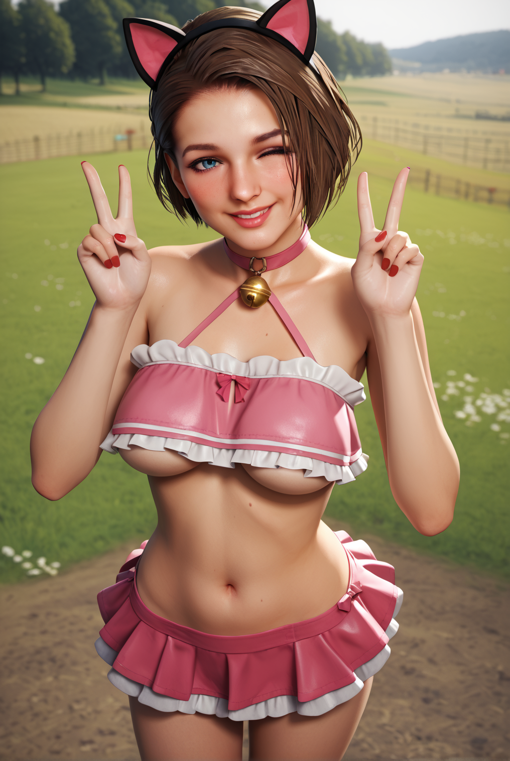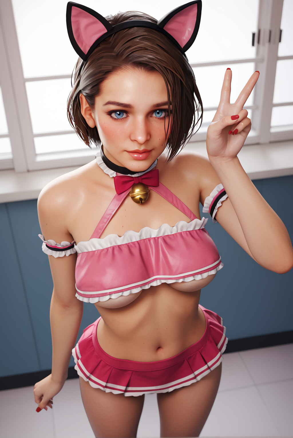 short hair, bob cut, brown hair, blue eyes