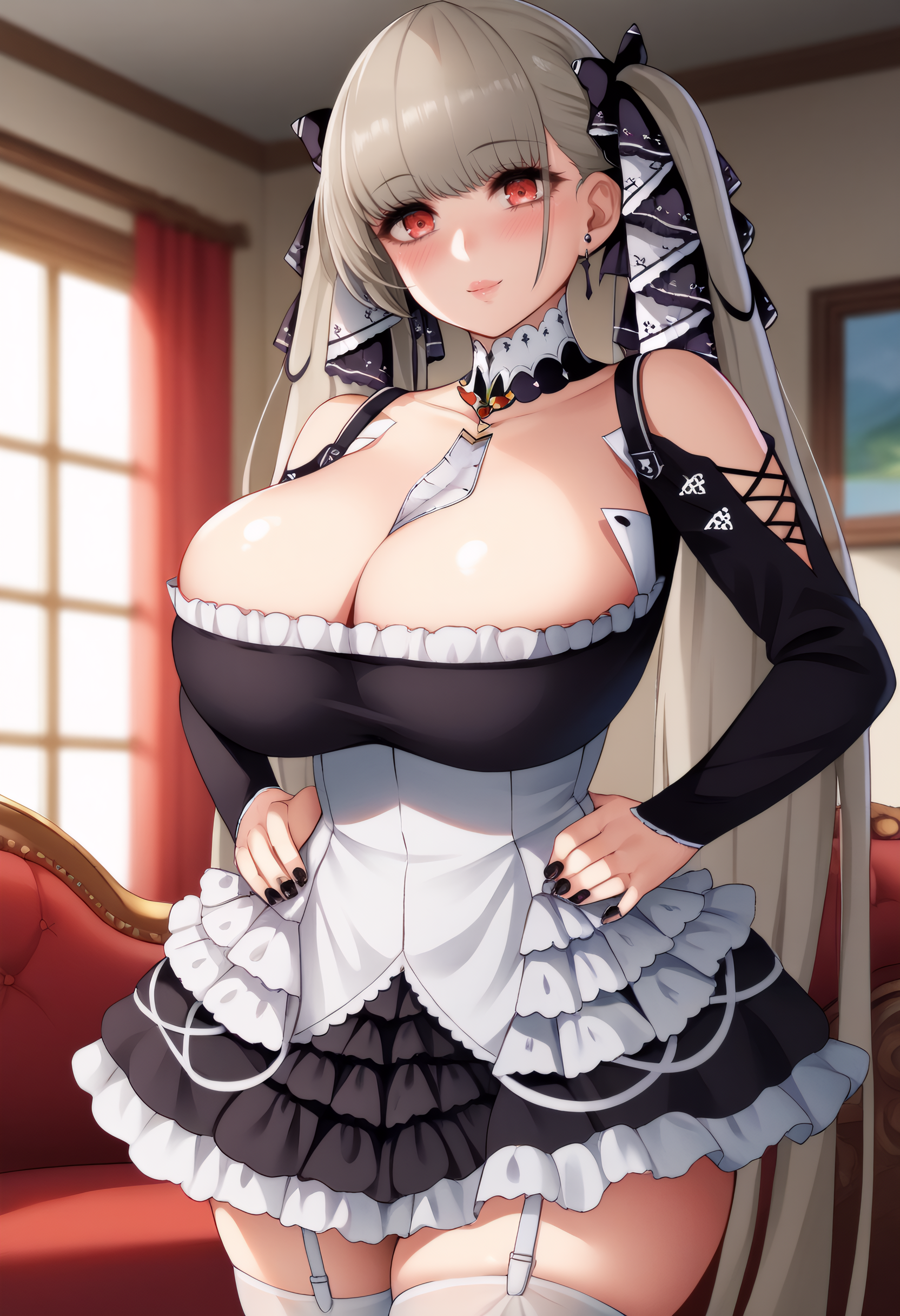 formidable_def, grey hair, red eyes, long hair, twintails, hair ribbon, two-tone ribbon, black dress, frilled dress, waist apron, bare shoulders, cleavage, two-tone dress, earrings, nail polish, black nails, jewelry, long sleeves, white thighhighs, detached collar, garter straps,