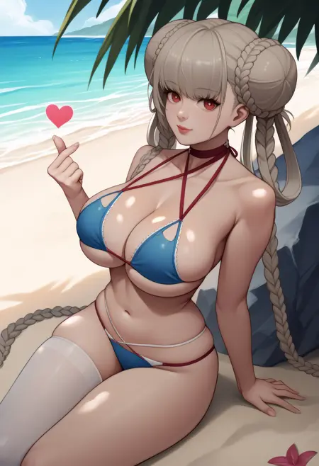 formidable_swim, grey hair, red eyes, long hair, hair bun, double bun, braided bun, twin braids, sidelocks, blue bikini, choker, white thighhigh, single thighhigh, halterneck,