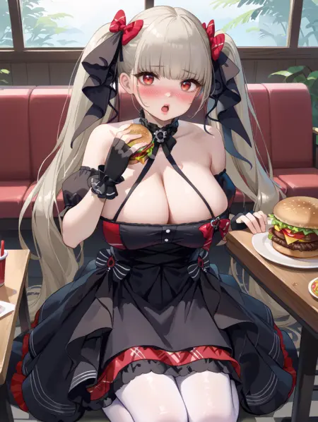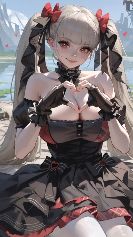 formidable_muse, grey hair, red eyes, long hair, twintails, black dress, two-tone dress, frilled dress, detached sleeves, black gloves, fingerless gloves, black ribbon, two-tone ribbon, bare shoulders, cleavage, hair ribbon, hair bow, white pantyhose,