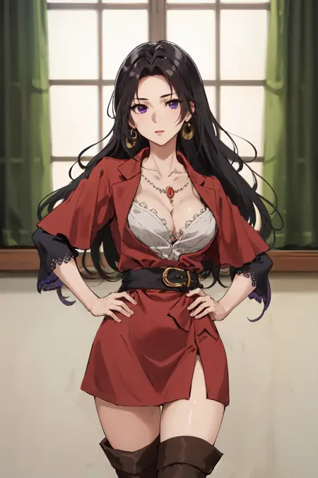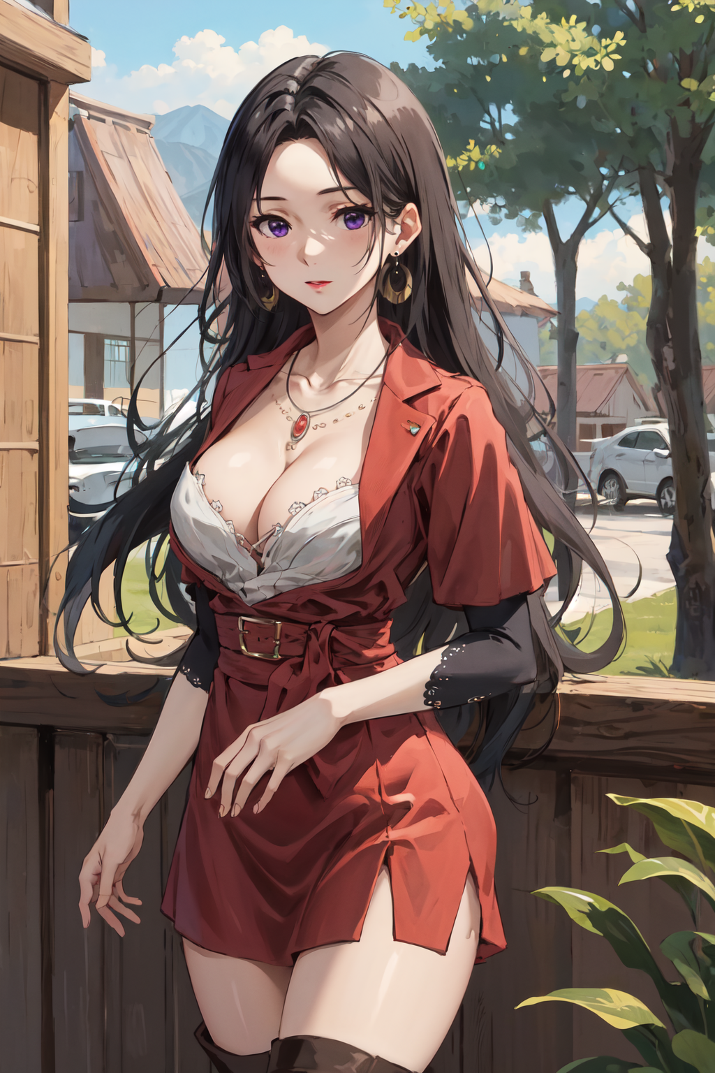 アウター11girl, black hair, long hair, purple eyes, necklace, earrings, thighhighs, red dress, cleavage