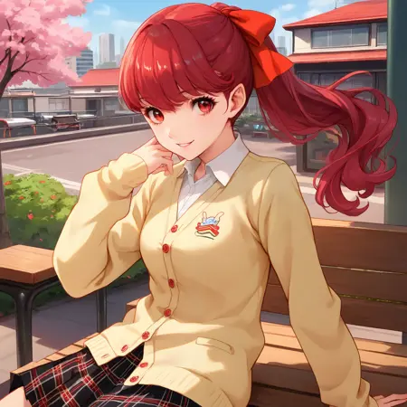 Summer Uniform : yoshizawa kasumi, summerxl, long hair, ponytail, red hair, hair ribbon, red eyes, white shirt, collared shirt, yellow cardigan, pleated skirt, school uniform, shuujin academy school uniform,