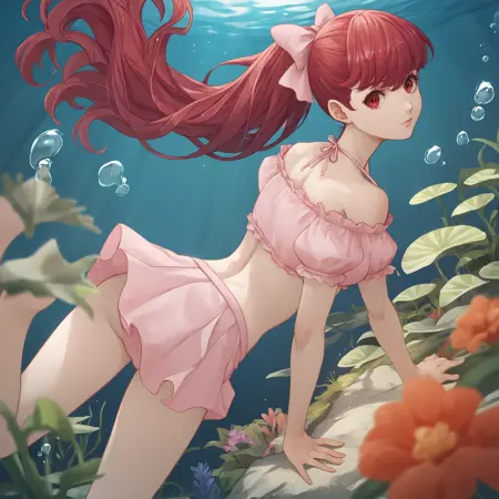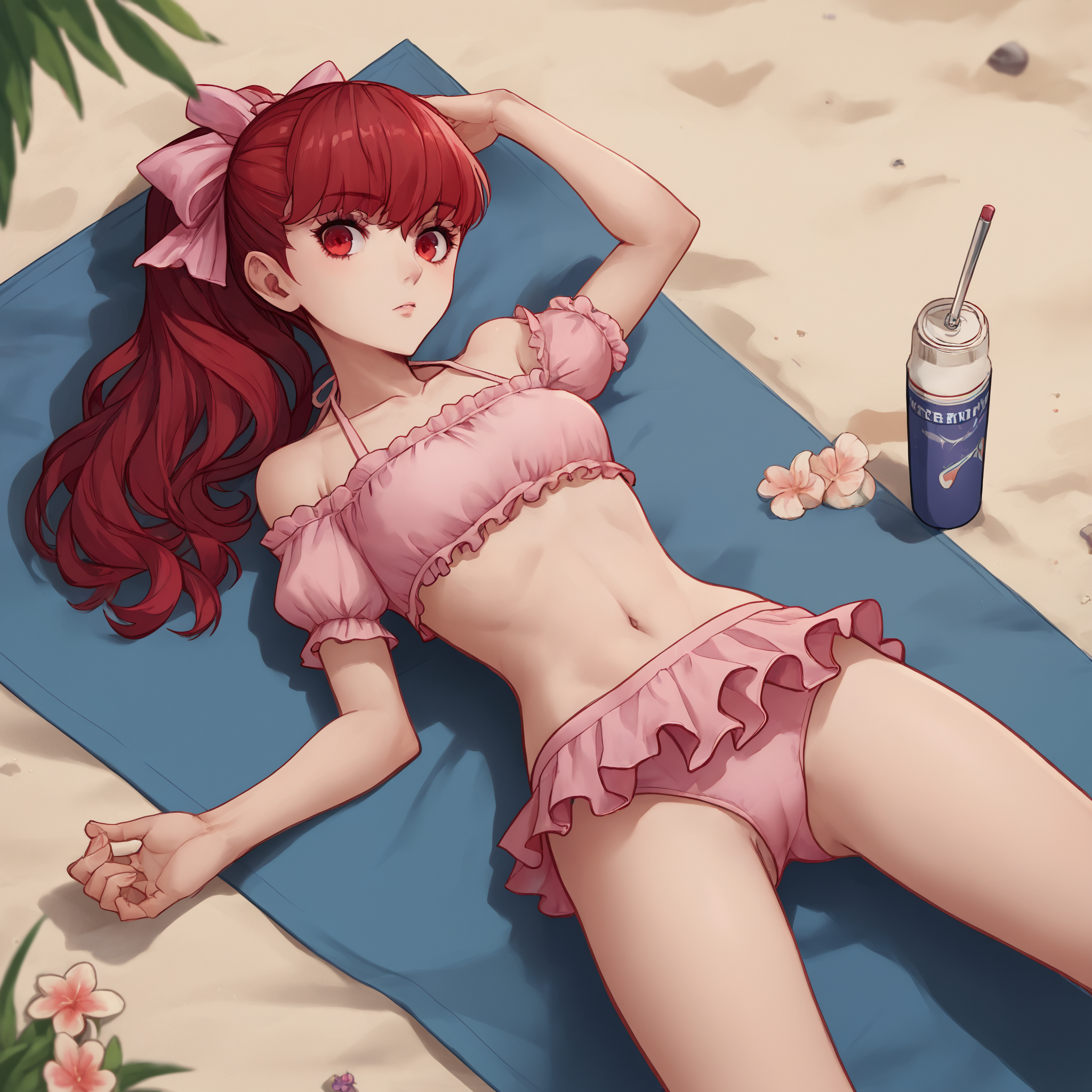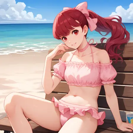 Bikini : yoshizawa kasumi, swimxl, long hair, ponytail, red hair, hair bow, red eyes, bare shoulders, short sleeves, frilled bikini, pink bikini,