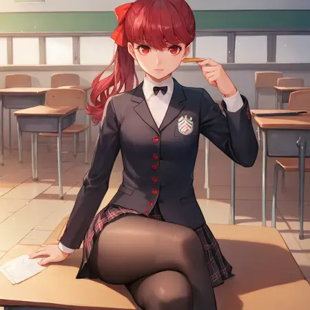 School Uniform : yoshizawa kasumi, yoshizawa school, long hair, ponytail, red hair, hair bow, red eyes, school uniform, shuujin academy school uniform, black jacket, pleated skirt, pantyhose,