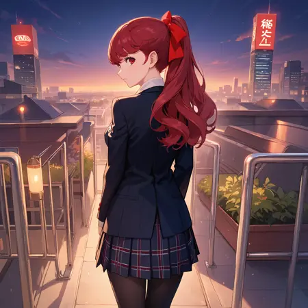 School Unifrom : yoshizawa kasumi, yoshizawa school, long hair, ponytail, red hair, hair bow, red eyes, school uniform, shuujin academy school uniform, black jacket, pleated skirt, pantyhose,