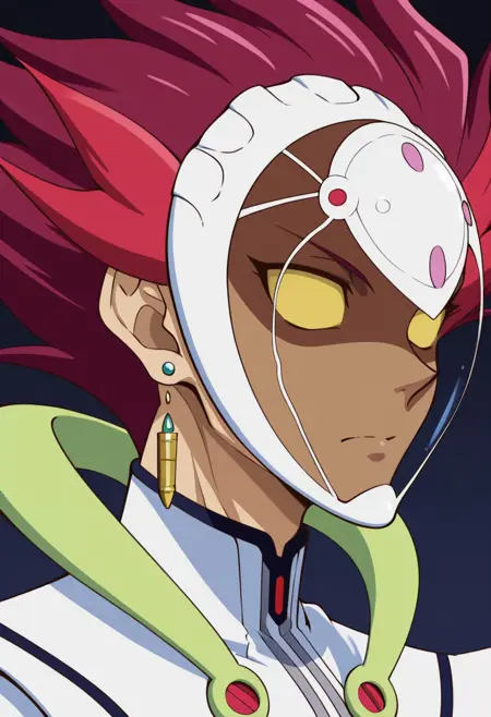 RyokKog,1个男孩,男性焦点,单人,Varis服装,面具,深色皮肤,空洞眼神,黄色眼白,耳环,红发,红白相间的紧身衣,外套,手套,靴子,红色鞋履,
