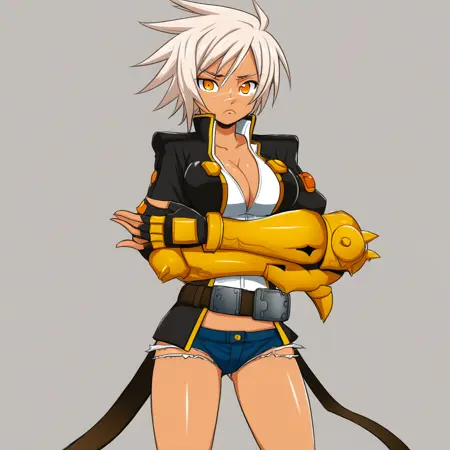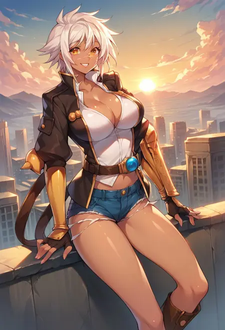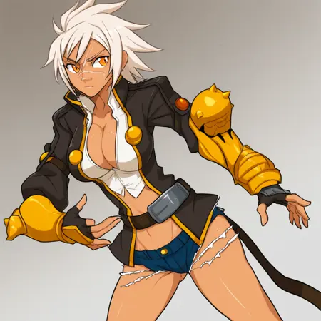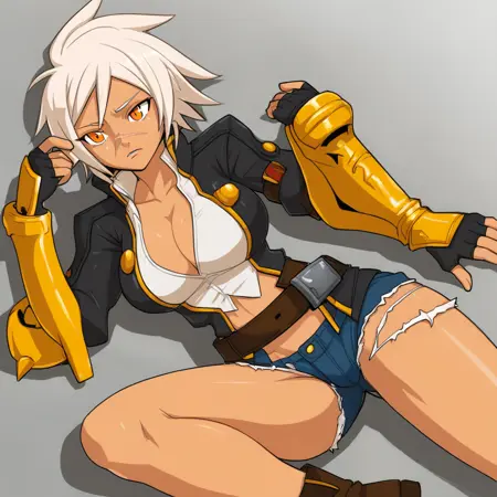 jacket, cropped top, denim shorts, gloves, fingerless gloves, cutoffs, gauntlets, cleavage, belt, brown footwear,