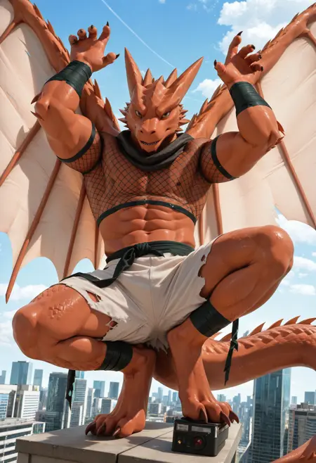 // Illustrious: rag0o_lar0nt_nek0jishi, dragon, scalie, male focus, wings, tail, furry, furry male, 1boy, cloth wraps, bara, solo, fishnet top, dragon boy, scales, white shorts, torn clothes