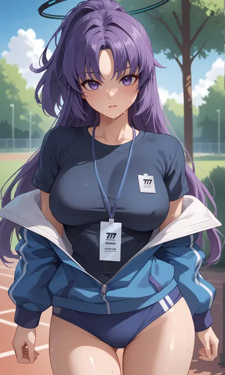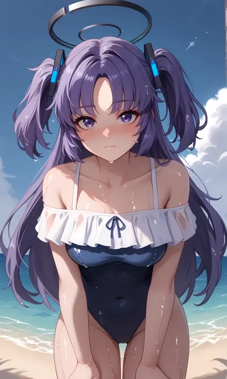 yuuka, purple eyes, purple hair, long hair, two side up, parted bangs, hair ornament, halo