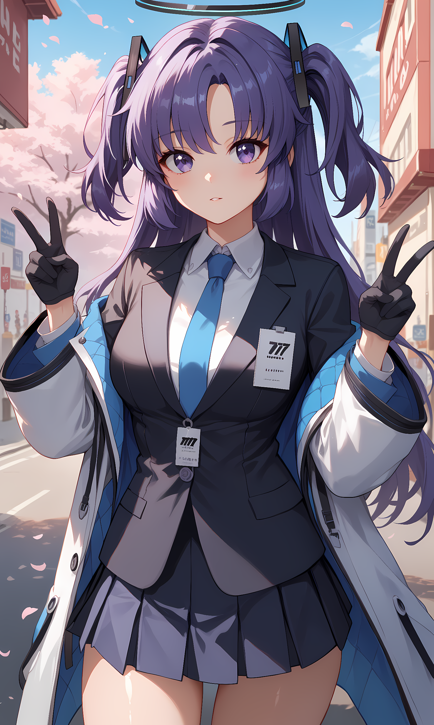 collared shirt, white coat, open coat, off-shoulder coat, black blazer, long sleeves, black gloves, blue necktie, black skirt, pleated skirt, miniskirt, black footwear