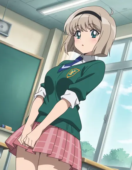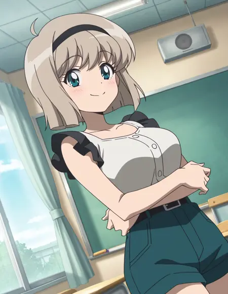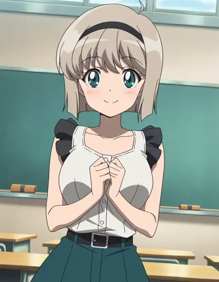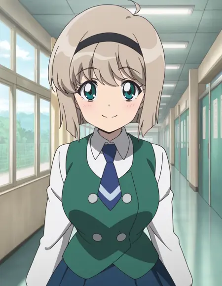 Miki H25, light brown hair, short hair,bangs, green eyes, black hairband, large breast, slim waist
