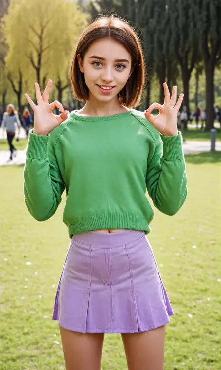 shoksi, onehnd, 빨간 셔츠와 파란 치마를 입은 날씬한 25세 소녀가 공원에서 한 손으로 ok 신호를 보이고 있다. 긴 금발 토트머리.