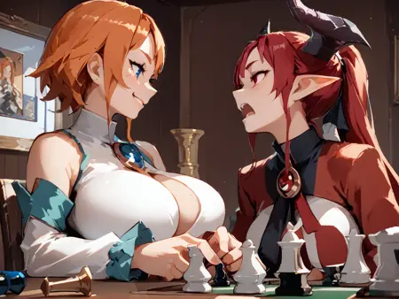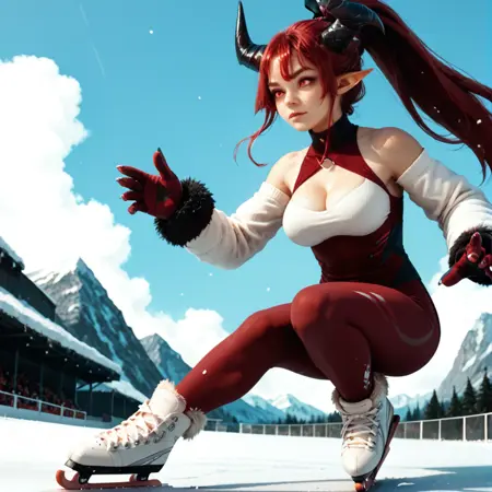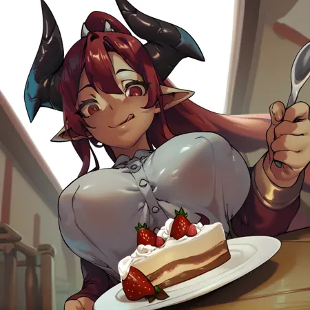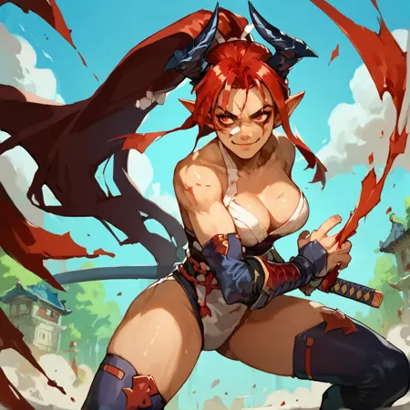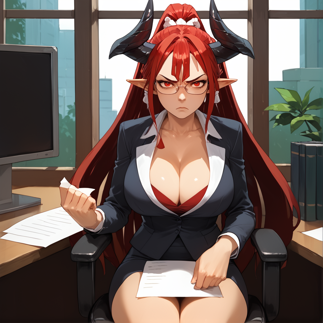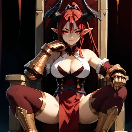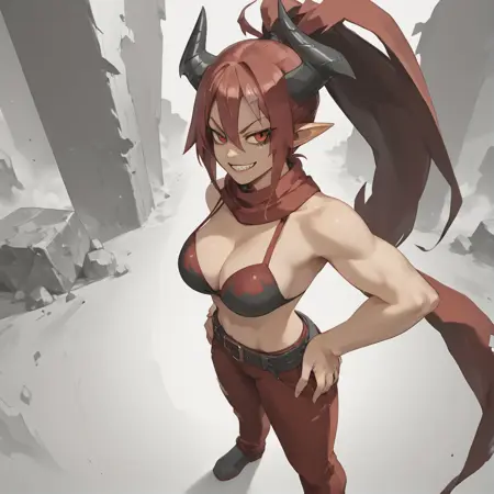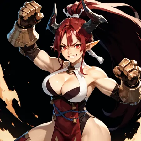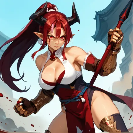 트리거: 히가안, 빨간 머리, 긴 머리, 뾰족한 귀, 뿔, 붉은 눈, 큰 가슴, 포니테일