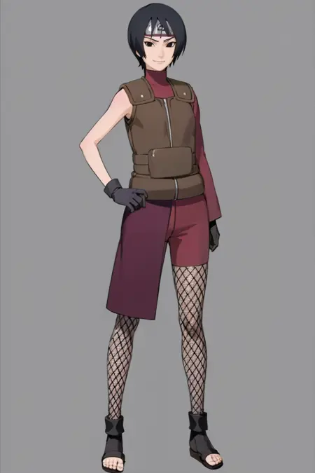 忍者衣装プロンプト:headband, forehead protector, flak jacket, fishnets, gloves, toeless shoes