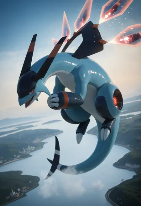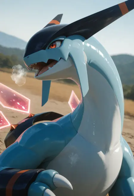 // Pony: jetragon, palworld, white and blue body, big belly, claws, tail, orange eyes, holographic wings, black head