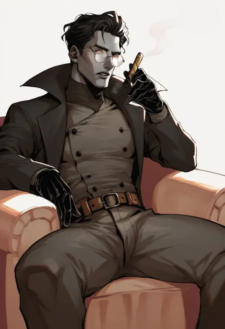 Unmasked: 1boy, glasses, short hair, shirt, vest, round eyewear, belt, black gloves, trench coat, black pants, slicked back, male, black boots