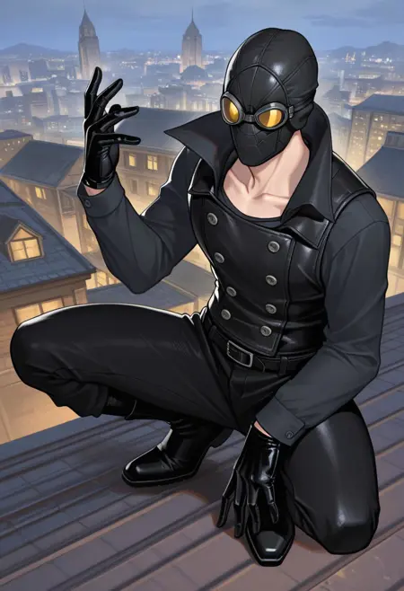 Superhero suit (No fedora and trench coat): 1boy, mask, belt, shirt, vest, black pants, black gloves, goggles, black boots, buttons, male