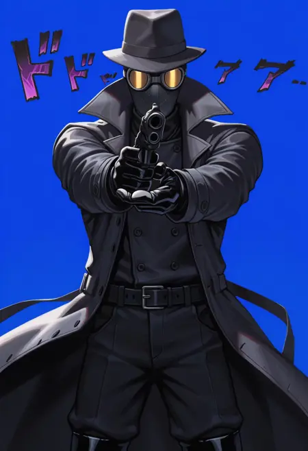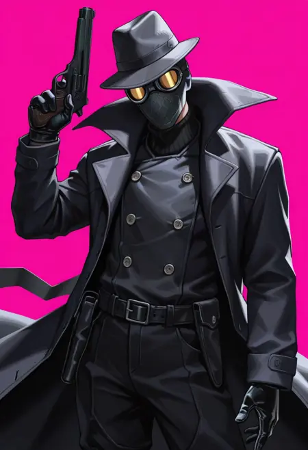 Default (Spiderverse Movie Outfit): 1boy, hat, fedora, trench coat, black gloves, belt, mask, goggles, buttons, black boots, male