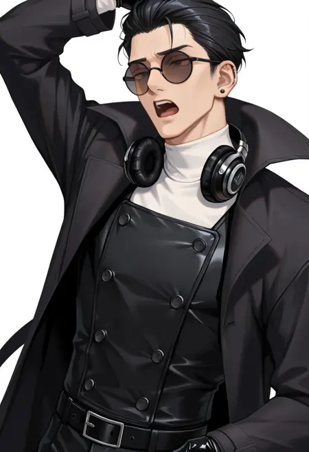 Unmasked: 1boy, glasses, short hair, shirt, vest, round eyewear, belt, black gloves, trench coat, black pants, slicked back, male, black boots
