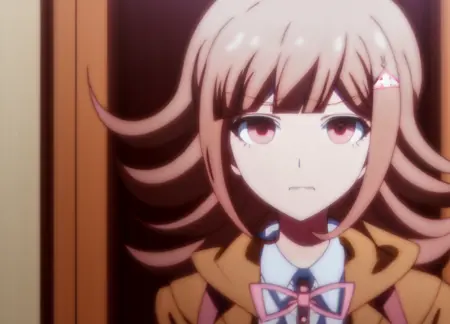 『ダンガンロンパ3』の衣装:この衣装は『ダンガンロンパ2』の黒い縦ストライプやHope's Peakの紋章をよく使用します。また、『ダンガンロンパ3』アニメのスタイルに近づく傾向があります。使用するには「Chiaki Nanami, Danganronpa 3 uniform, brown blazer, cream hooded cardigan, dress shirt, pink ribbon, short dusty pink hair, Galaga hairpin」としてください。