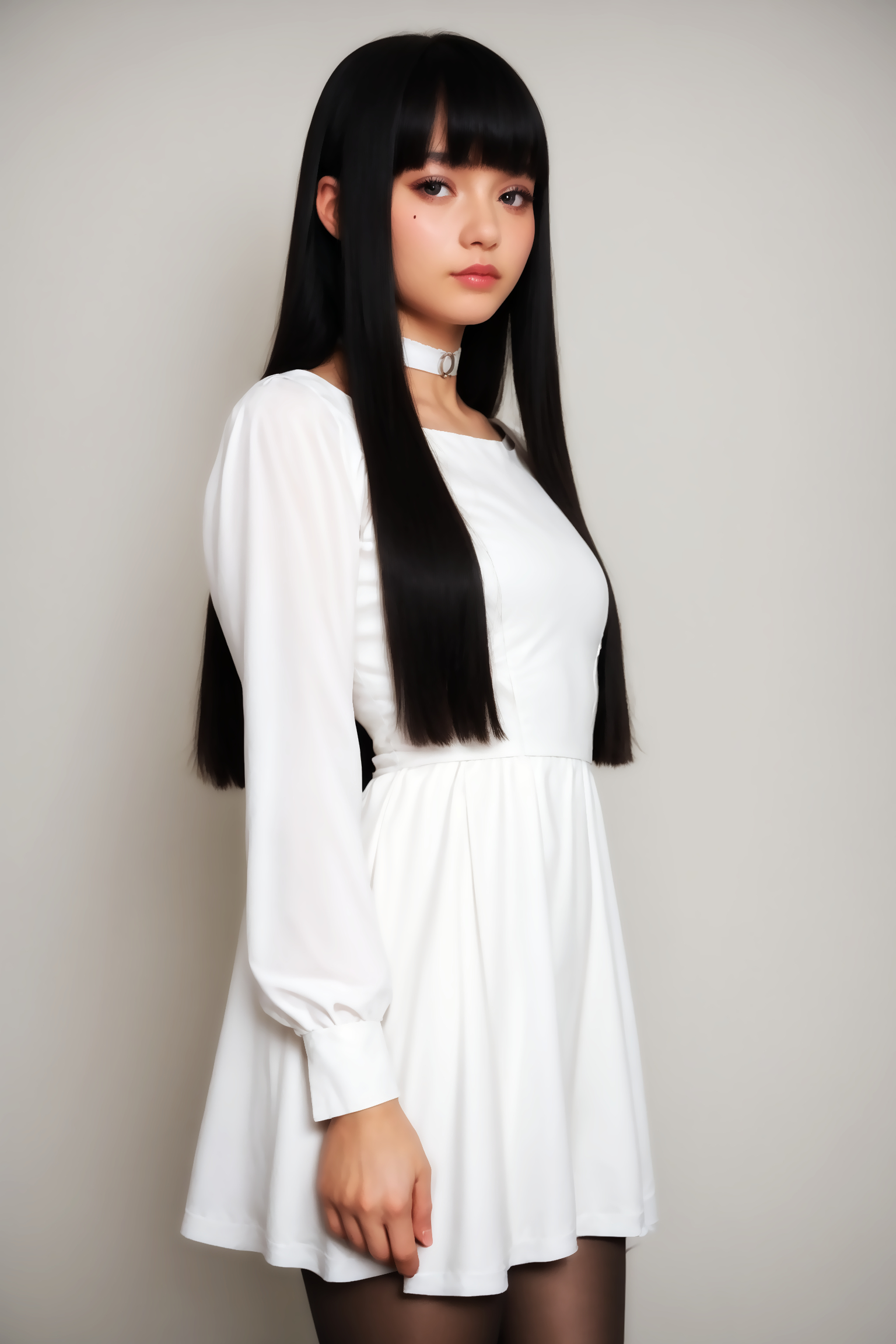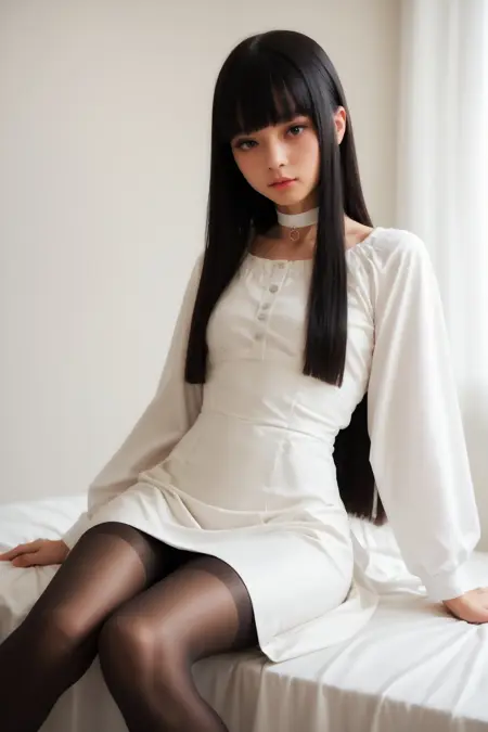복장 트리거: 드레스, 흰 드레스, 흰 목걸이, 팬티스타킹, 긴 소매