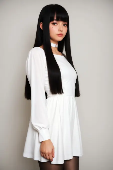 服装触发词:连衣裙,白色连衣裙,白色项圈,丝袜,长袖