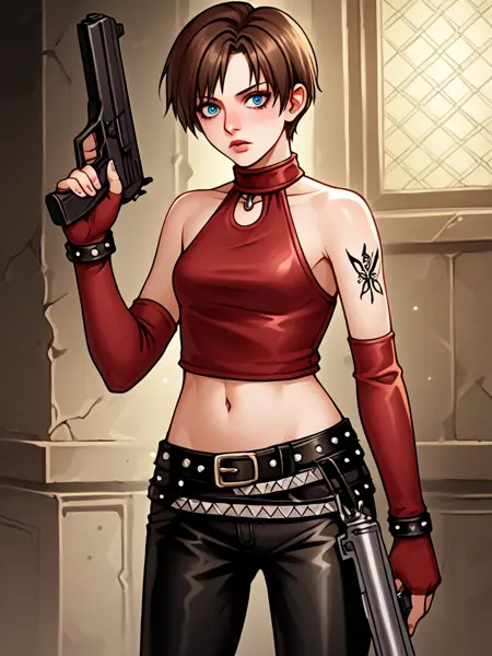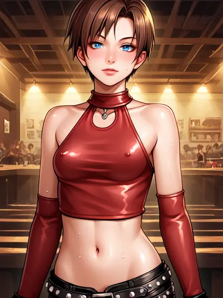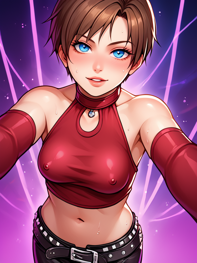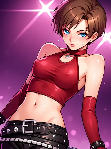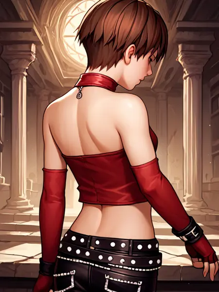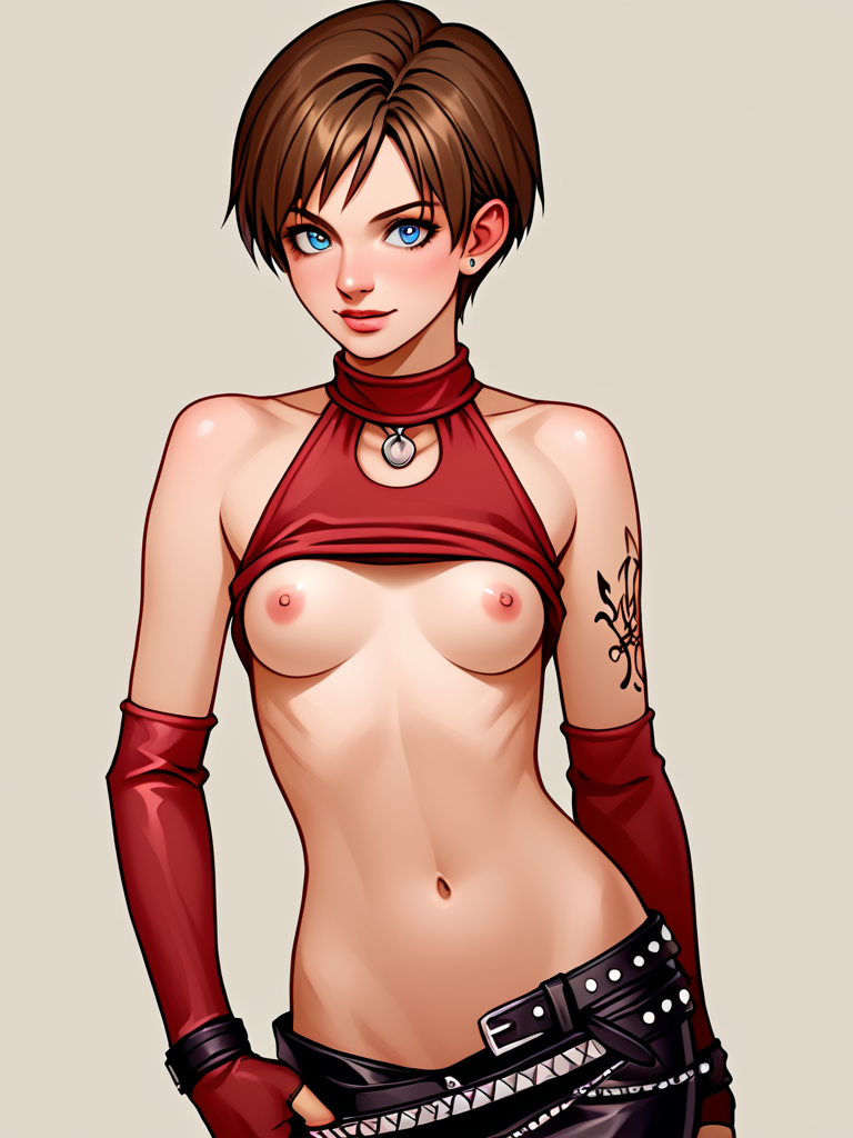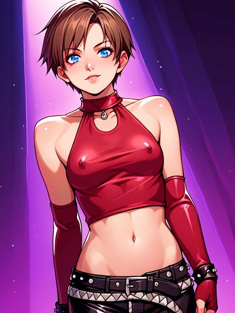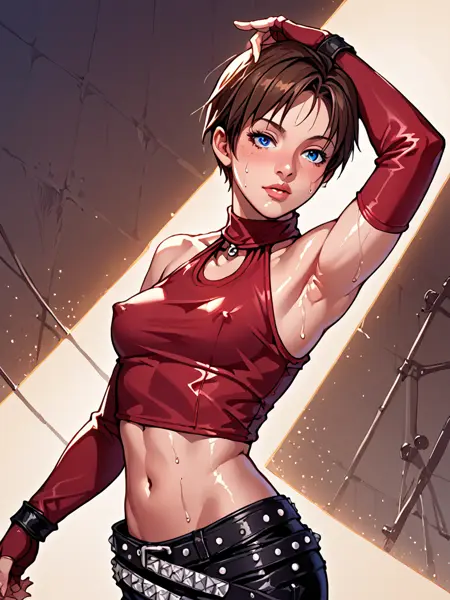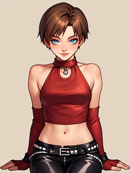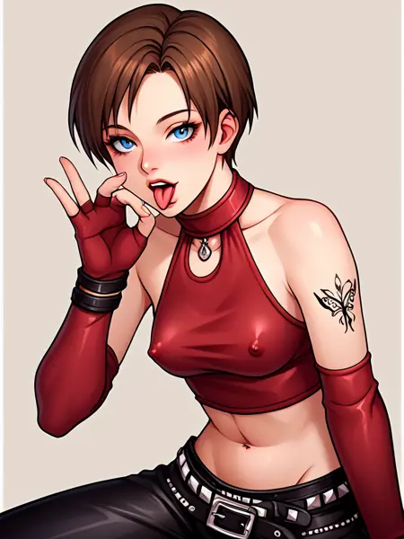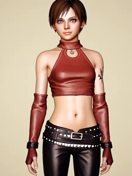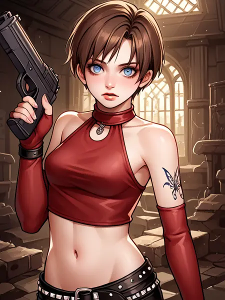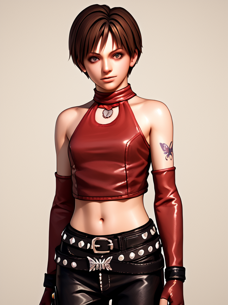 becky_crop, red halter crop top, black leather pants, red elbow gloves, fingerless gloves, midriff, navel, 1girl, short hair, brunette, blue eyes, belt, studded belt, boots, butterfly tattoo