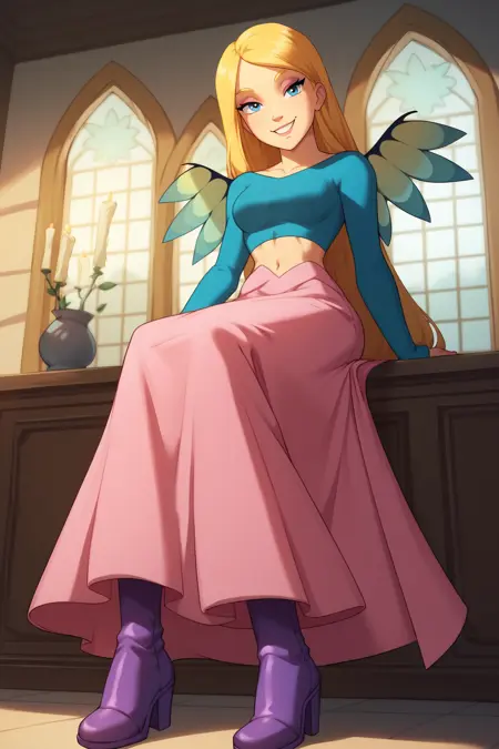 ➜ CorneliaHaleWITCHXL, 푸른 눈, 금발, 긴 머리, 중간 크기의 가슴, 날개, 아쿠아 컬러 크롭 탑, 긴 소매, 분홍색 스커트, 긴 스커트, 줄무늬 허벅지 양말, 보라색 부츠