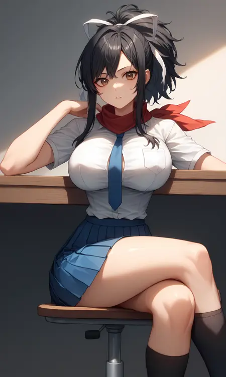 明日香、茶色の目、黒髪、ロングヘア、ポニーテール、白いリボン、髪飾り