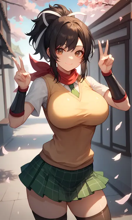 赤いスカーフ、白いシャツ、短めの袖、茶色のベスト、セーターベスト、緑のネクタイ、緑のスカート、チェック柄スカート、プリーツスカート、ブラックの太ももまであるストッキング、アームパッド、茶色の靴
