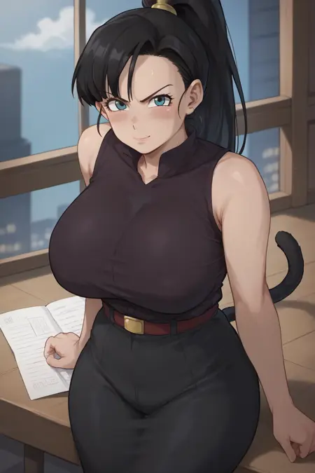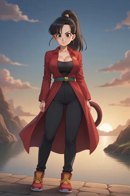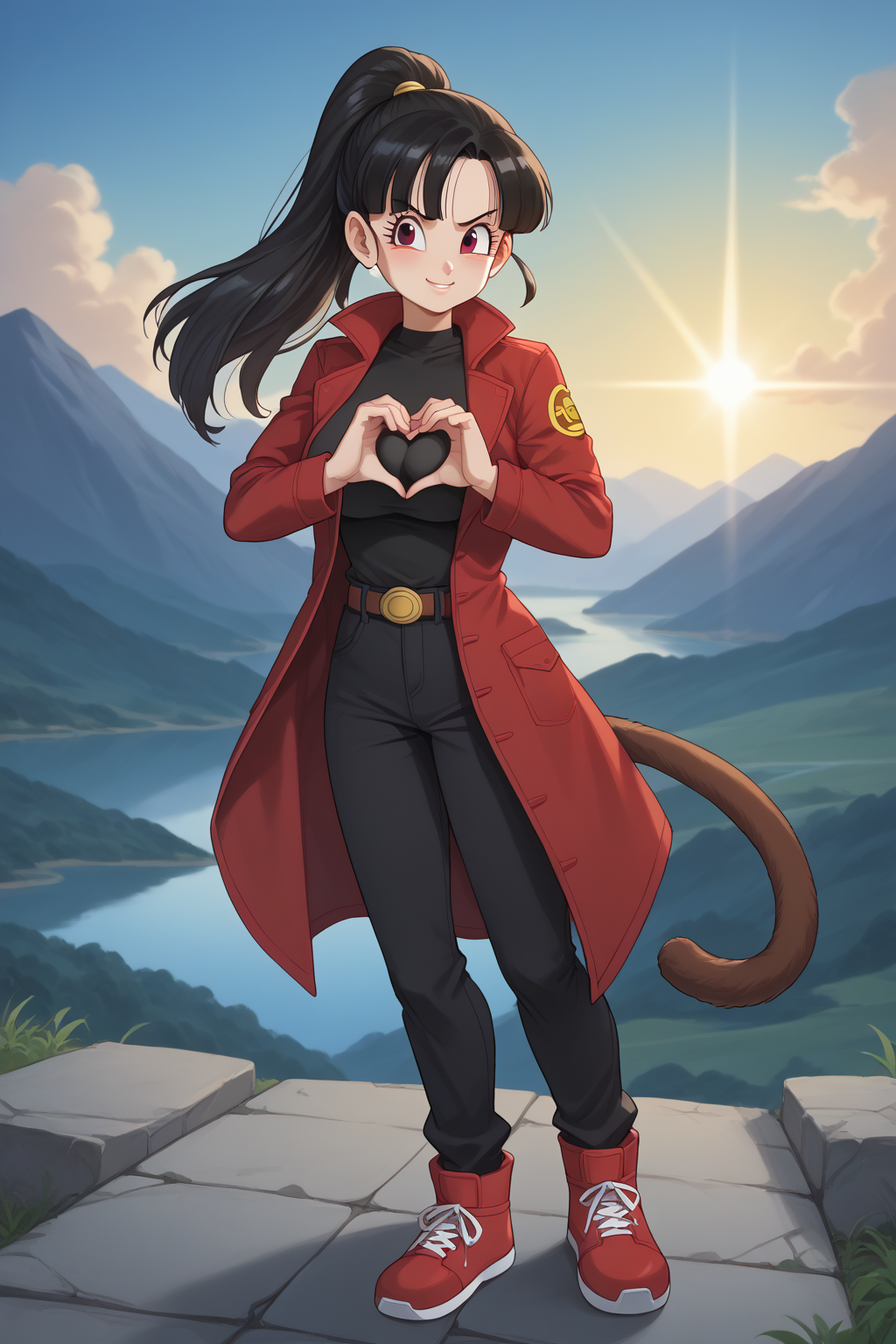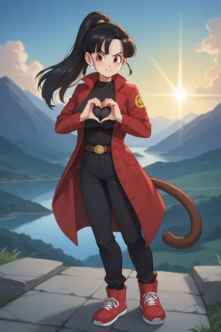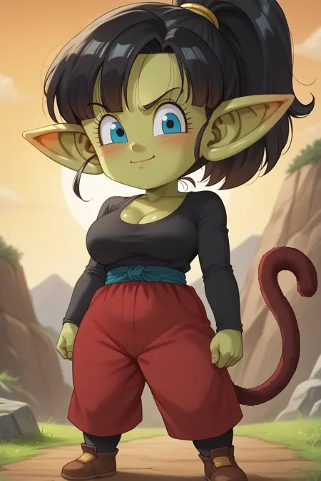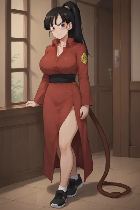 프롬프트: note (dragon_ball), 검은 머리, 말꼬리, 꼬리, 원숭이 꼬리, 빨간 리본, 헤어피스, 큰 가슴, 파란 눈,
