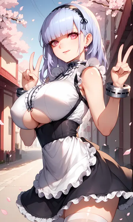 anchor choker, metal wrist cuffs, sleeveless shirt, underboob cutout, waist apron, frilled apron, black skirt, frilled skirt, white thighhighs, shoes