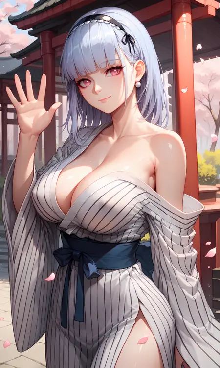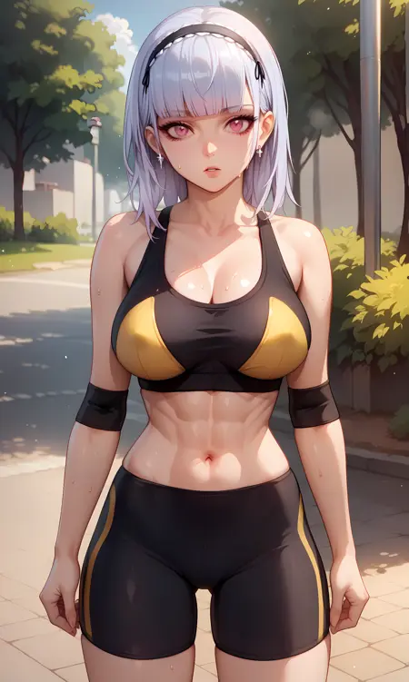 dido, pink eyes, gray hair, long hair, blunt bangs, hairband, earrings