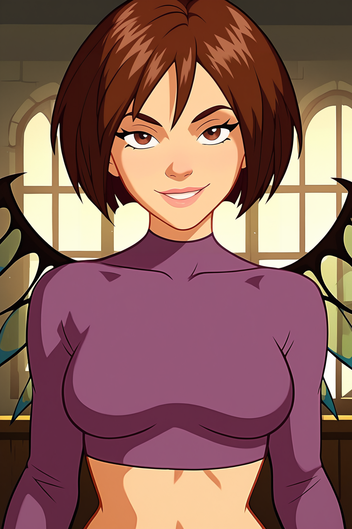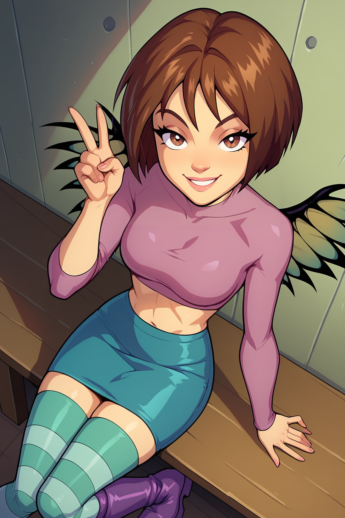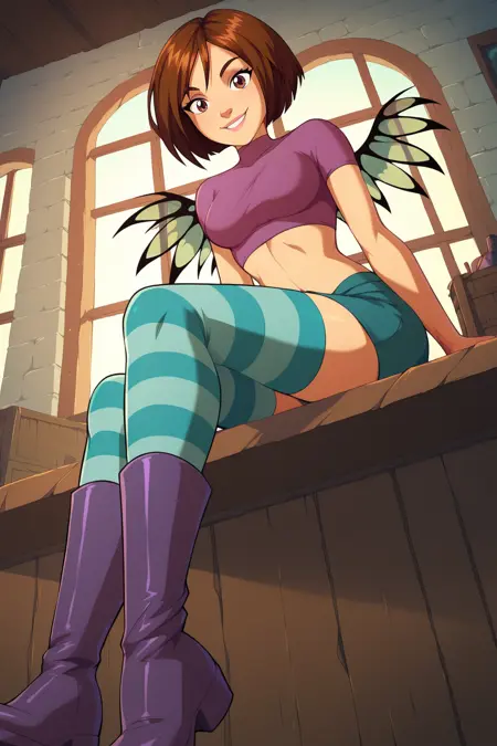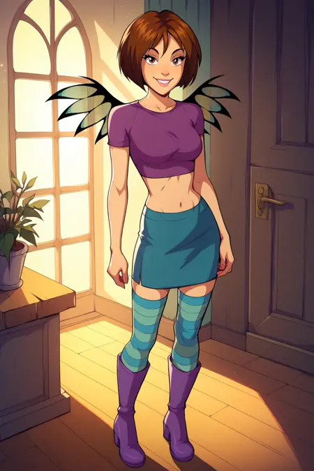 ➜ WillVandomWITCHXL, 갈색 눈, 갈색 머리, 단발, 볼 커트, 눈 사이 머리, 중간 크기 가슴, 날개, 보라색 크롭탑, 긴 소매, 아쿠아 스커트, 줄무늬 허벅지 스타킹, 보라색 부츠