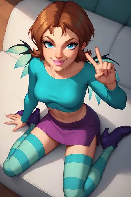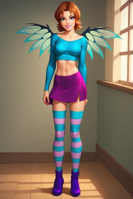 ➜ IrmaLairWITCHXL, 핑크 립, 푸른 눈, 갈색 머리, 단발, 중간 크기 가슴, 날개, 아쿠아 크롭탑, 긴 소매, 보라색 치마, 줄무늬 허벅지 양말, 보라색 신발