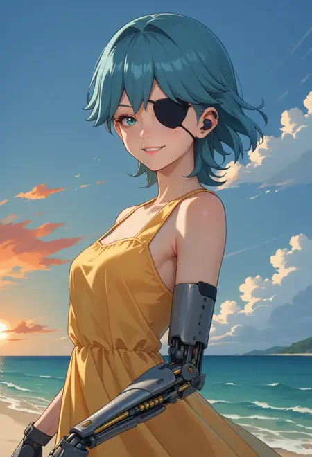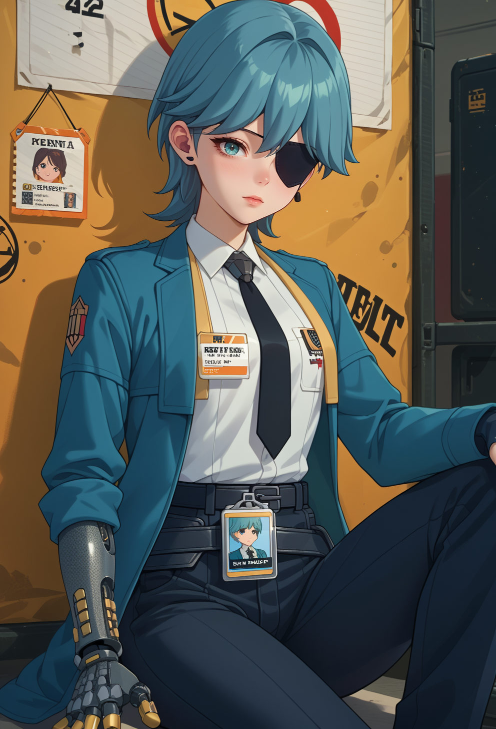 aqua eyes, blue eyes, blue hair, short hair, prosthetic arm, single mechanical arm, eyepatch,