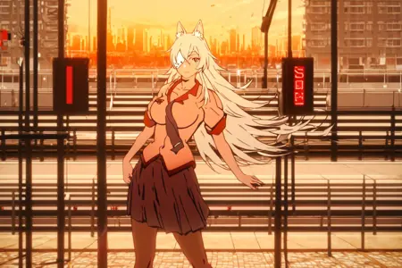 夕暮れの光の雰囲気用プロンプト: bakemonogatari_style, 暖かいオレンジ色のトーン、オレンジの空